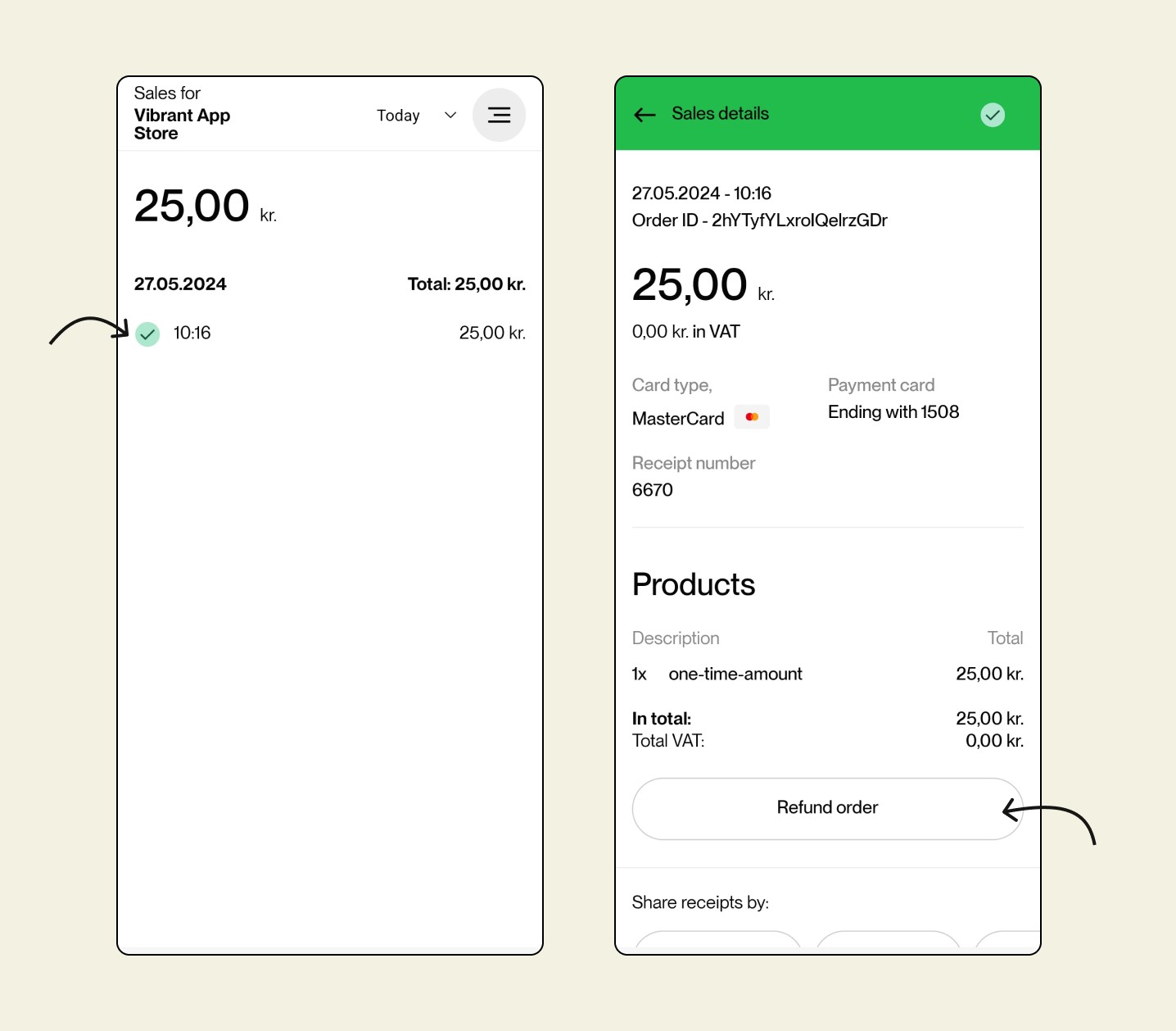 Du kan dele refunderingens kvittering direkte med din kunde fra appen eller få adgang til og dele den oprindelige transaktionskvittering, hvis det er nødvendigt.
