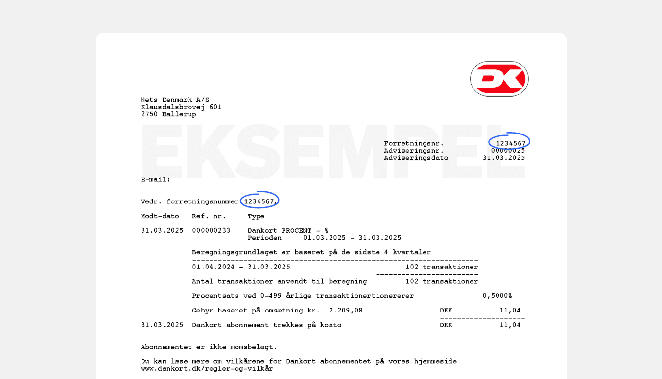 Eksempel på, hvor man kan finde Dankort forretningsnummer