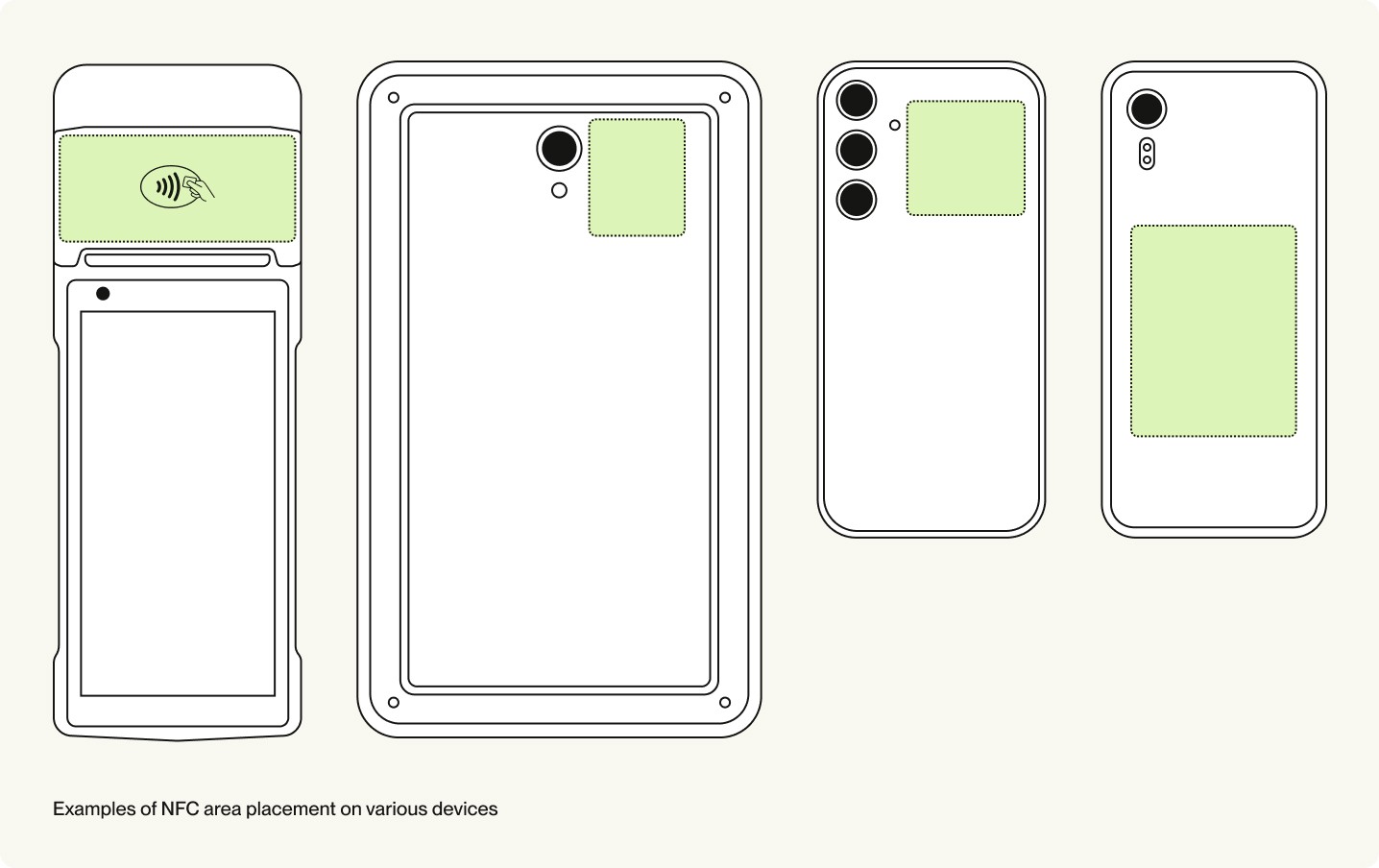 Bed dem om at holde deres kreditkort, debetkort eller mobile wallet (telefon eller smartwatch) tæt på det kontaktløse område på din terminal. Placeringen af NFC-chippen kan variere en smule afhængigt af den specifikke terminalmodel, du har:
